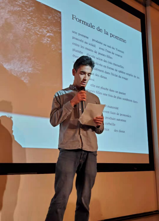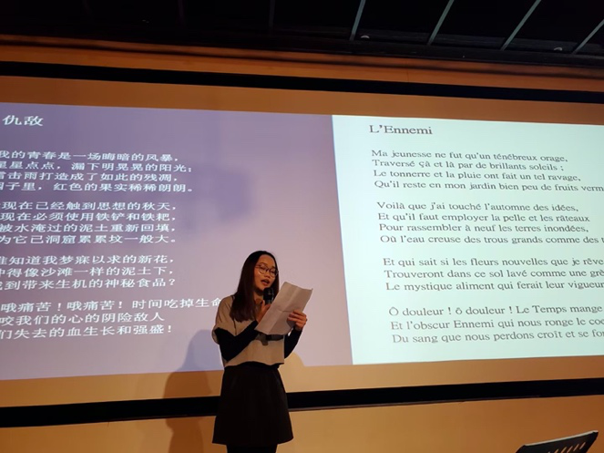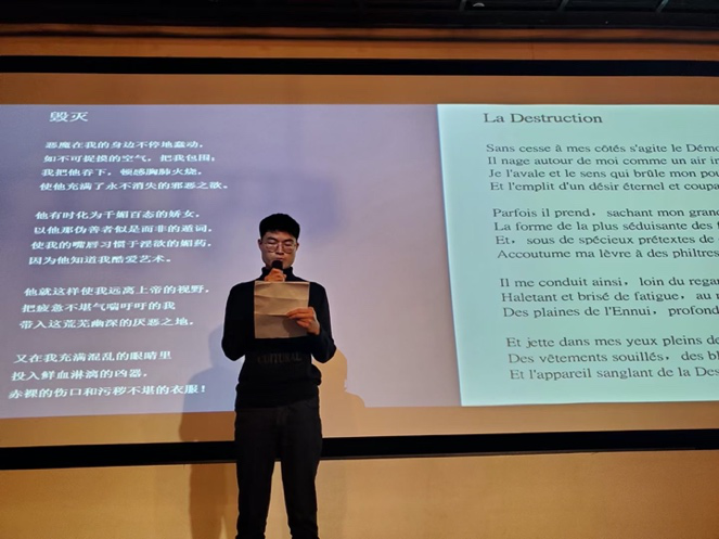 在纪念波德莱尔专场中,舒凌鸿副教授对波德莱尔的生平和代表作品,以及他对中国诗人与诗歌的影响进行了精彩阐述。诗人于坚先生与大家分享了他自己以波德莱尔为题创作的诗歌。另外,昆明法盟外教玛丽(Marie)老师,旅居昆明的法国诗歌爱好者雅米拉(Jamila)女士,以及两位云南大学法语语言文学硕士研究生代表赖灿杰和吴怡分别用法语朗诵多首以“渴望”为题的波德莱尔诗歌。值得一提的是,吴怡同学成功入围3月中旬举办的第五届法语诗歌翻译大赛西南区半决赛。