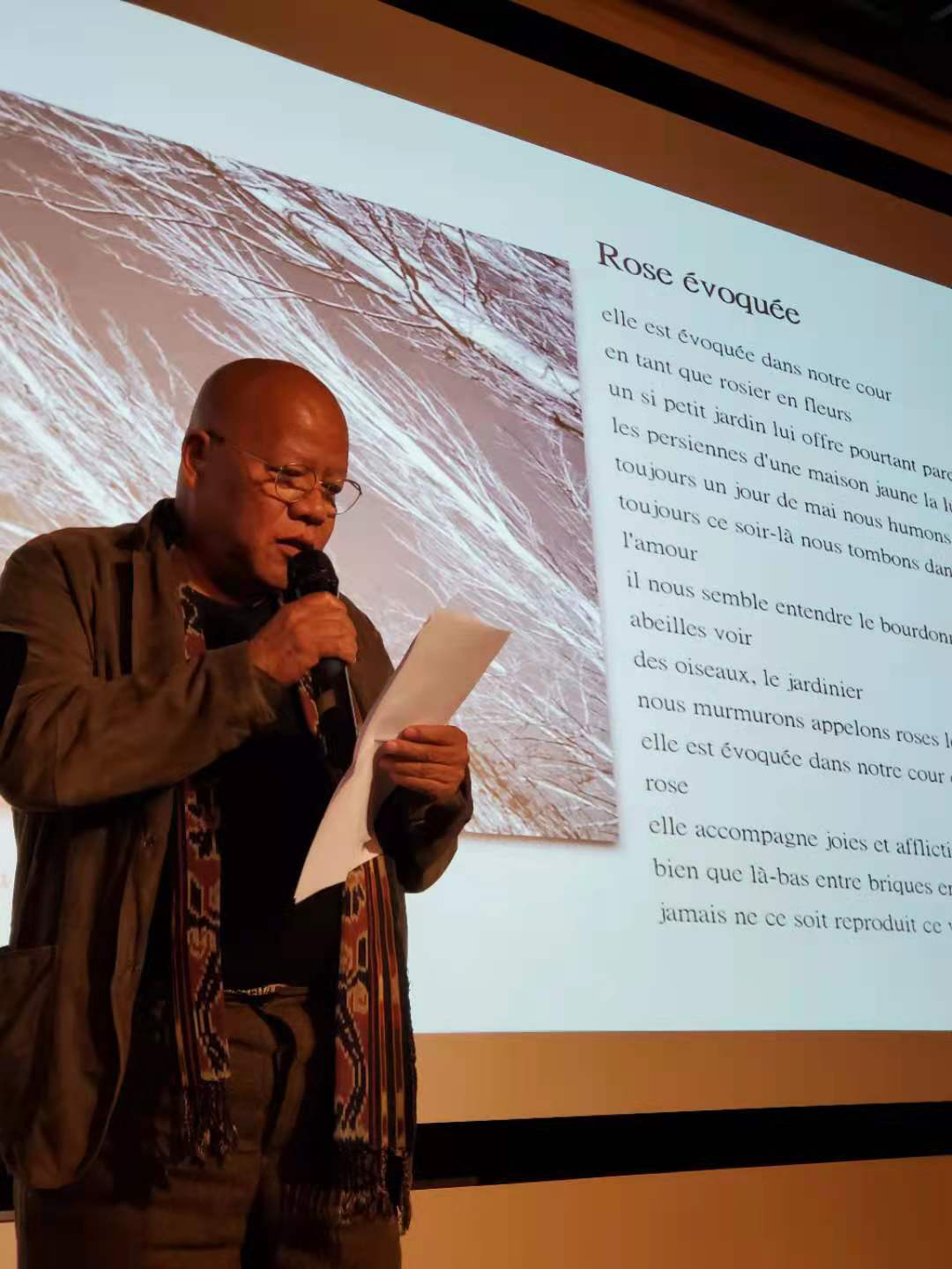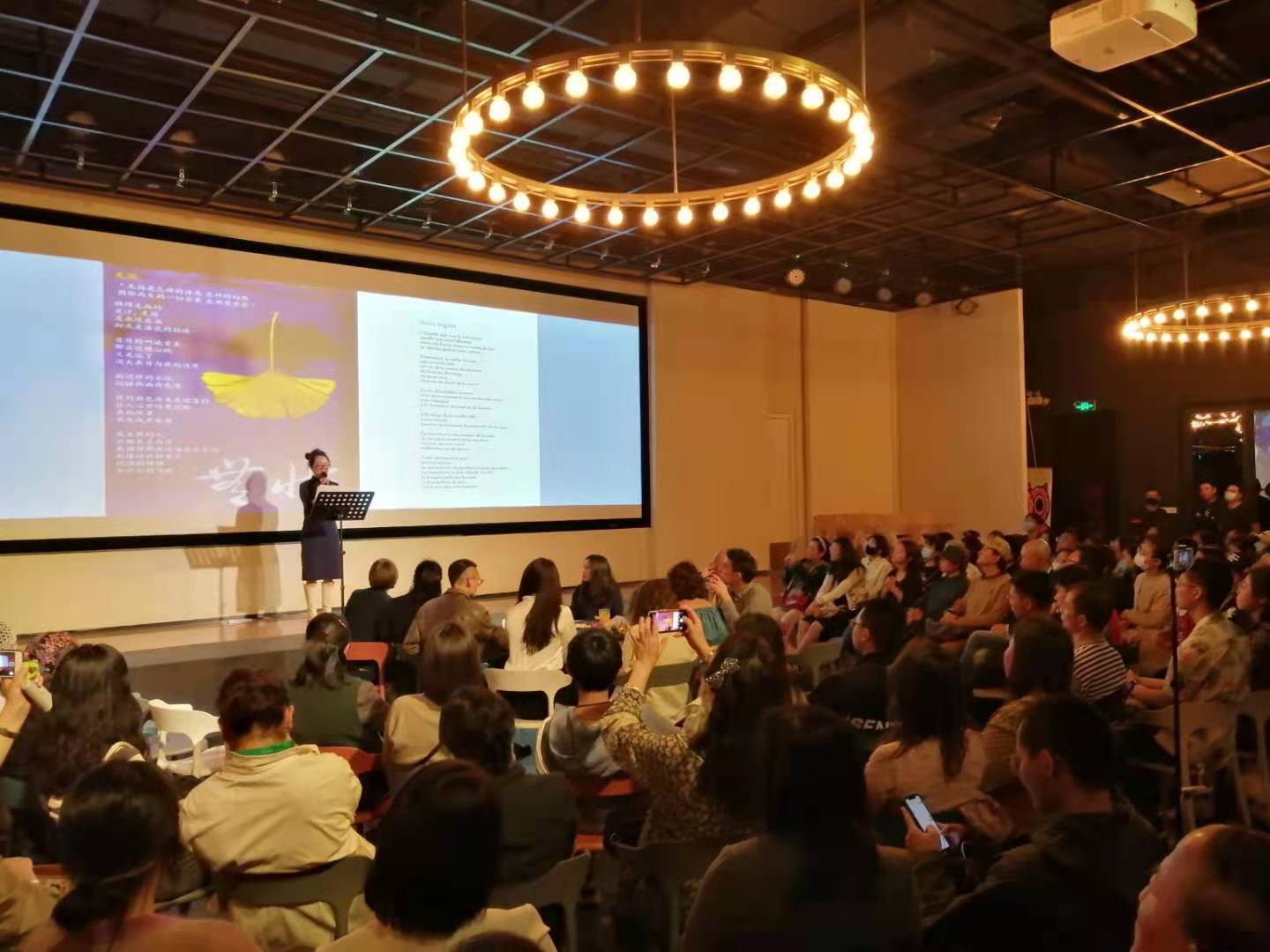 著名诗人于坚教授朗诵了自己的诗歌《被暗示的玫瑰》与《苹果的法则》,并由杜方绥朗读了于坚诗歌的法语译版。两位青年诗人红布条儿与陈秦少浮也朗读和分享了各自创作的诗歌。另外,大家共同鉴赏了四位来自不同国家地区的法语当代诗人特别为本次活动录制了诗歌朗诵视频。