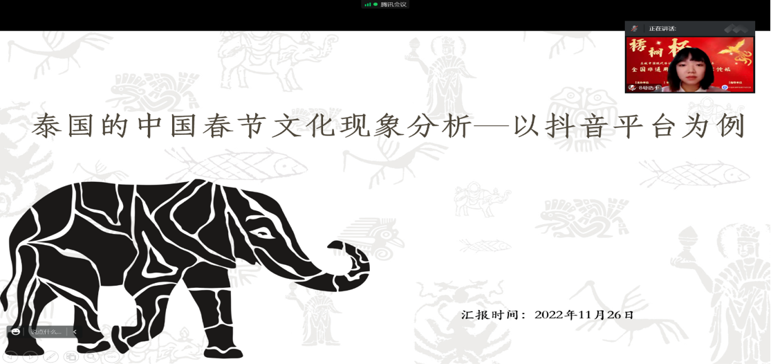 “梧桐杯”第二届全国非通用语大学生学术论坛以“庆祝中国现代外语非通用语高等教育80周年”为契机,由北京第二外国语学院主办,外语教学与研究出版社协办,中国非通用语教学研究会学术指导,北京第二外国语学院亚洲学院承办。万象城体育|平台泰语参赛团队于2022年7月30日提交初赛论文稿,在全国14所高校170余篇论文中脱颖而出,成功进入复赛。万象城体育|平台学生的参赛论文题目为《泰国的中国春节文化现象分析——以抖音平台为例》,文章通过对抖音短视频平台上有关在泰中国春节的文化现象进行分析,对其中的文化元素进行提取,分析背后的原因,进而得到对中华优秀传统文化海外传播方面的启示。
